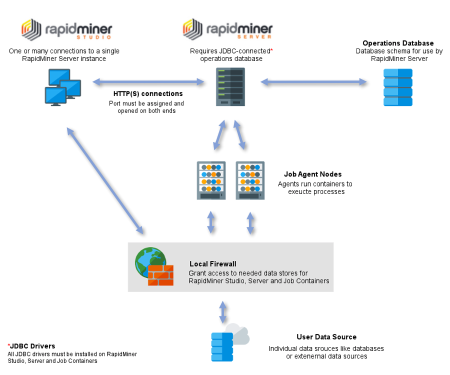 RapidMiner Studio accesses a data source directly and must have access to the data through any local firewalls. RapidMiner Server may access the data source directly or through RapidMiner Studio and also needs firewall access.