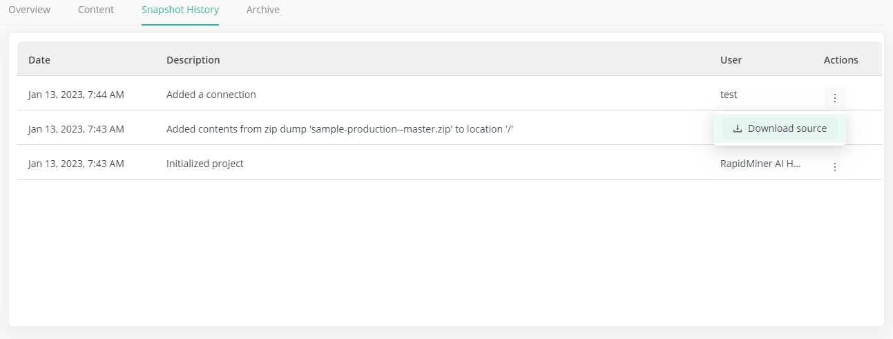 The Snapshot History page displays the history of the Project. Each row in the table corresponds to a Snapshot.