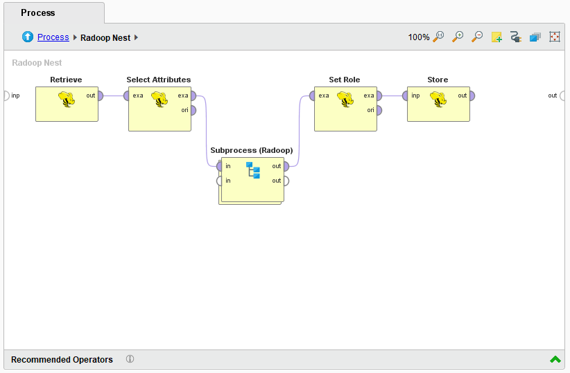 To create a connection override, take your offending operator and encapsulate it into a relevant nest operator. In our example we will use the Subprocess (Radoop) operator.