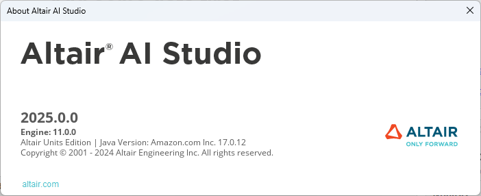 Altair AI Studio 2025.0 is now shipped with Java 17. The release is compatible with AI Hub 2025.0 and previous versions (10.x and 2024.x) of Altair AI Hub.