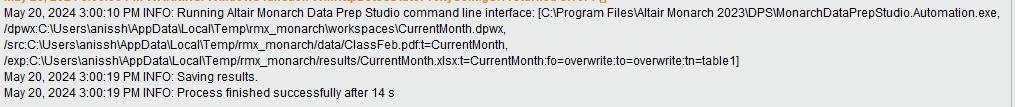 After running the process, change to the log view to see the Altair Monarch Data Prep Studio command line call that has been executed based on the process configuration.