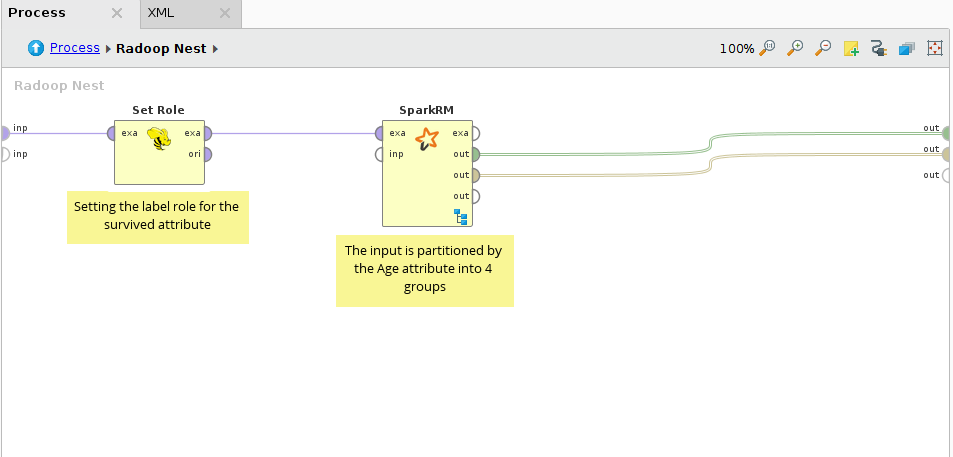 In the Radoop Nest the survived attribute is specified as the label, and the data is connected to the first (Example Set) input port of SparkRM. For the SparkRM operator attribute partitioning is set and the discretized Age attribute is set as the partitioning attribute. This results in 4 partitions. We expect to build different predictive models for the different age categories.