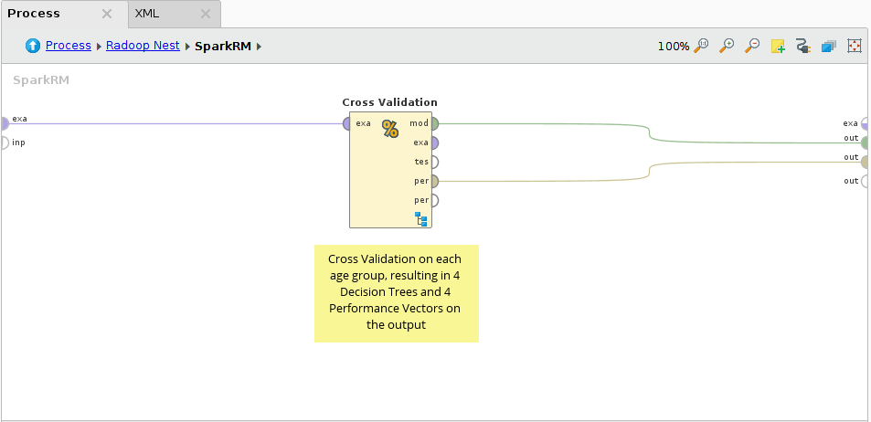 In the pushdown process Cross Validation with a Decision Tree modeler is performed on the 4 partitions in parallel. On SparkRM's output only two IOObject output ports are used, the Example Set output is not connected, because we do not alter the dataset, just build models on it (on its partitions).