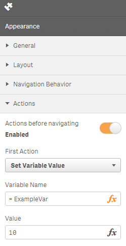 - Create a Sheet Navigation & Action object on the dashboard. Such objects can be created once the Sense Navigation extension has been installed to Qlik Sense.
