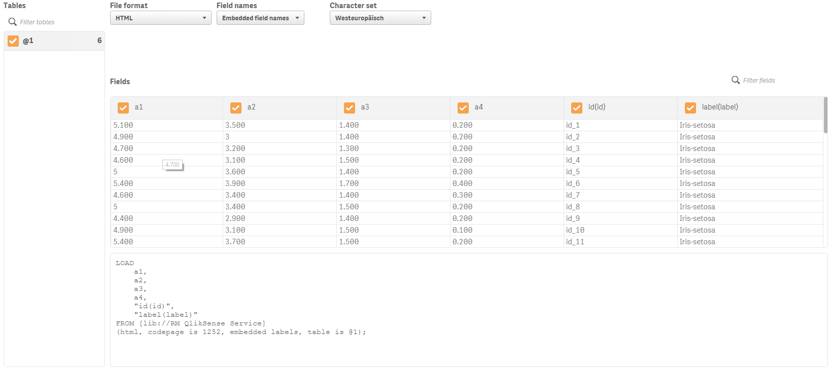 - When the Data load button is clicked on the right side, Qlik Sense will call the RapidMiner web service and RapidMiner Server will execute the process behind the web service. Depending on the complexity of your process and the amount of data, this step can take some time. Once RapidMiner server has executed the process and all data is received by Qlik Sense, a new window will open.