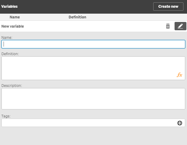 - To create Qlik Sense Variable go to Edit on the dashboard sheet and select the Variables button on the left bottom. The following window will pop up.