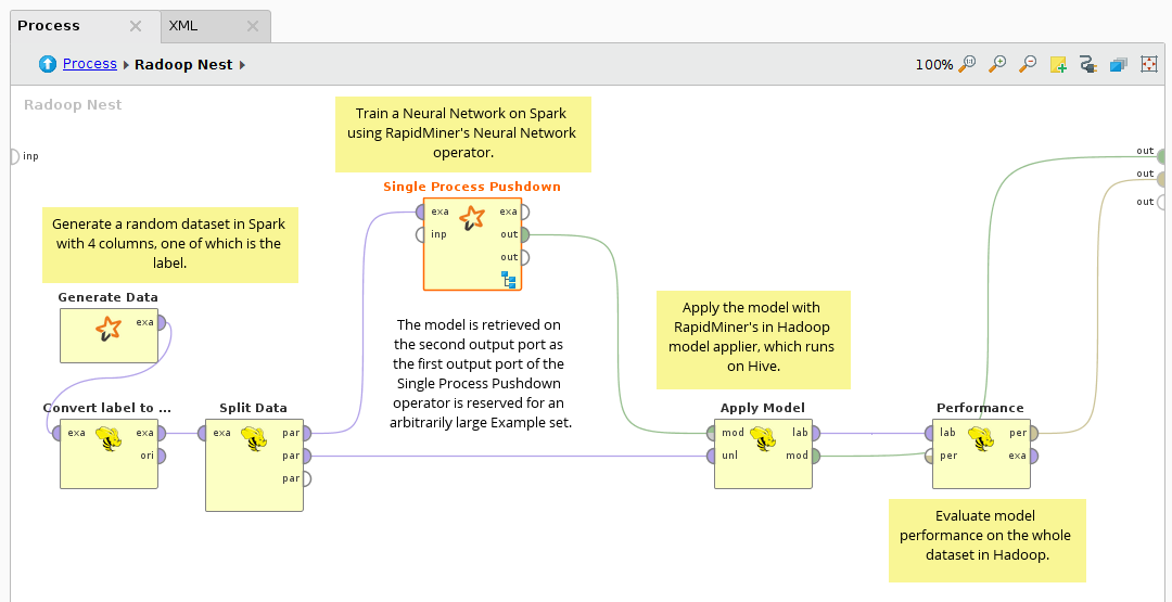 Single Process Pushdown accepts an arbitrarily large HadoopExampleSet on the first input, and any IOObject on the subsequent input ports. Likewise, it delivers a large HadoopExampleSet on the first output and any IOObject on the other output ports.
