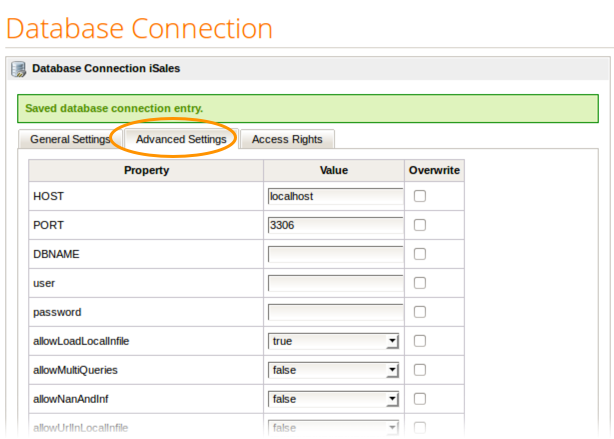 Database connection properties are defined by the JDBC driver of your database. These driver-dependent settings are listed (and set) in the Advanced Settings tab of the Database Connection window. See your database and JDBC driver documentation for a description of each property. To access the settings: