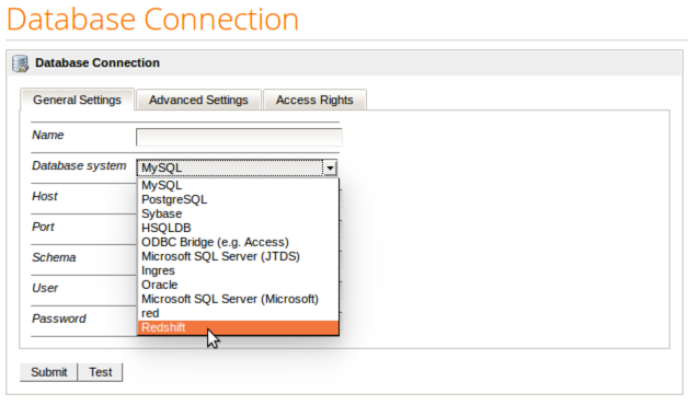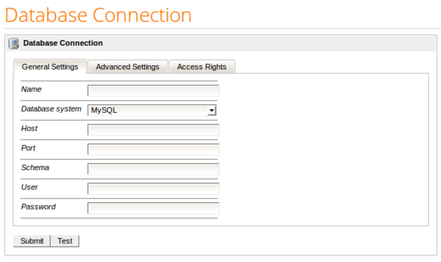 Parameter Description Name Enter a name for the connection. Database system From the drop-down list, select the system the database uses. If your system isn't listed, you must first add the JDBC driver. Host Enter the hostname or IP address for the local machine hosting the database connection. See the special note on using "localhost" as a host name. Port Enter the port number used to access the database. Schema Enter the name of the schema that defines the portion of the database to be used by RapidMiner processes. User Enter the name of the user with login privileges to the database. Password Enter the password for the user with login privileges to the database. When you are finished making changes, click Test to check the connection. When the test passes, click Submit to save the new connection: