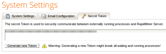 Modify the secret token of your RapidMiner Server used by external processes such as the RapidMiner Job Agents