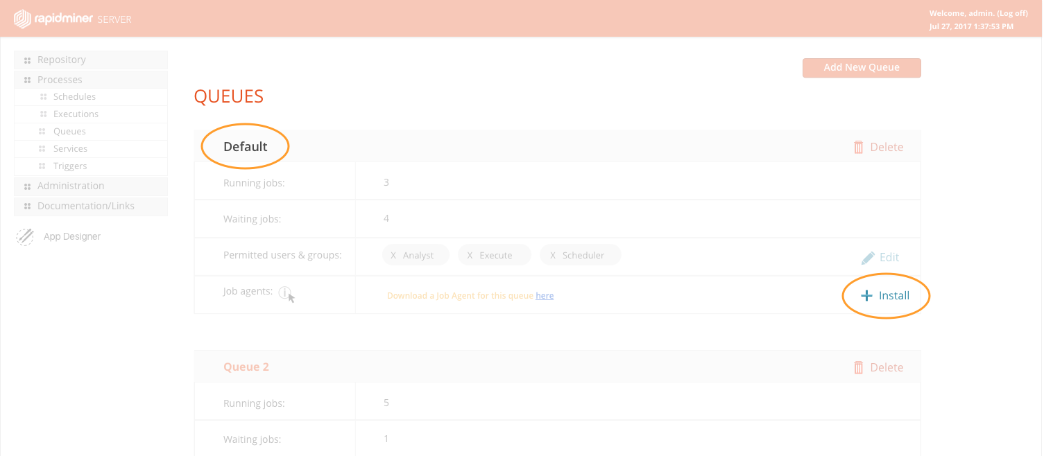 Job Agents are tied to one execution queue (See Administration > Process execution queues) and can be downloaded from the queue configuration page on server by clicking Install. Each agent is pre-configured based on the queue it was downloaded for. For example, if you download an agent from the link provided under DEFAULT queue, that agent will connect to server and fetch jobs from that queue.