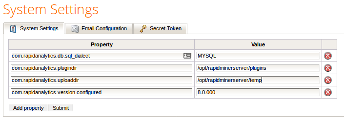 To add properties: If the property you wish to set is not present in the System Settings list, click on Add property. RapidMiner Server adds a row to the properties table. Enter the property name in the Property field of the new row and the value in the Value field. Refer to the table of system settings for assistance. Click Submit to save and apply the new setting(s).