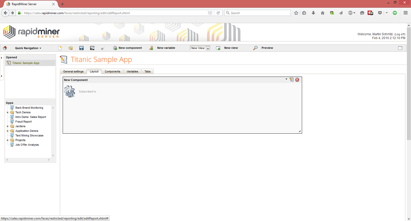Be sure to save this process. We are now done on the Studio side. Let's move to the server. Please rerun the initialization process by clicking on the blue arrow right next to the location of initialization process. After doing so move to the Layout tab. In this tab we can arrange different visualization components. The components of a dashboard are available by clicking on the New component button in the upper panel.