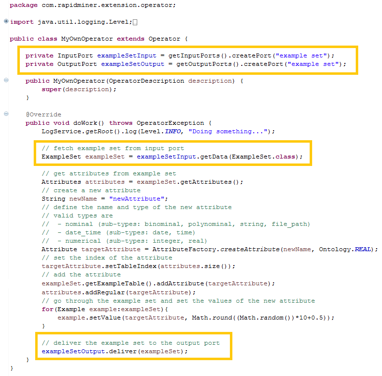 To fill the doWork() method with content, add a new attribute with random values from 1 to 10 to the example set received from the input port.