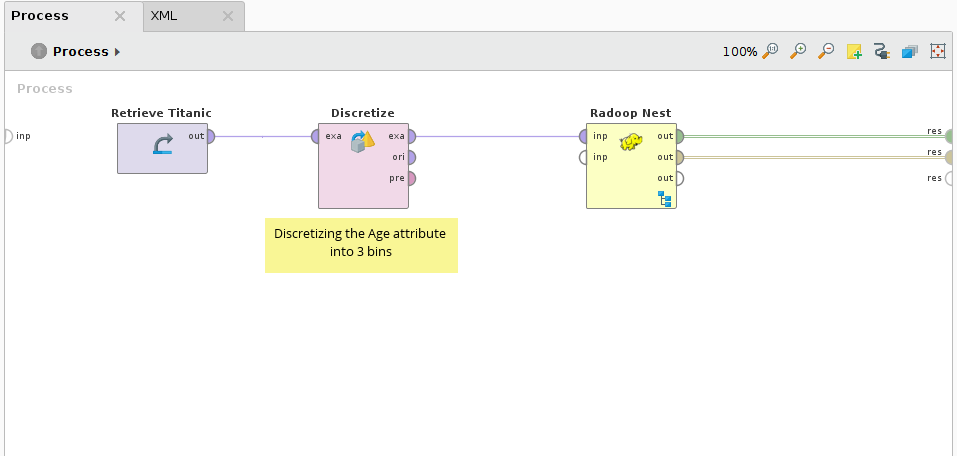 First the Titanic sample dataset is retrieved and the Age attribute is discretized into 3 bins. This results in 4 different values in the Age attribute: range1 [-∞ - 26.778]; range2 [26.778 - 53.389]; range3 [53.389 - ∞] and the missings. Please note that it is not recommended for real life use cases to use RapidMiner Radoop operators on data that fits in RapidMiner Studio's memory (like the Titanic dataset). If you have big data, use Radoop's Retrieve (recommended) or Read CSV operators inside the Nest to access your input.
