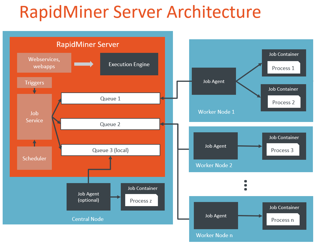 In the diagram below, each blue box represents a separate machine. RapidMiner Server is installed on the big blue box on the left, while the blue boxes on the right host remote Job Agents.