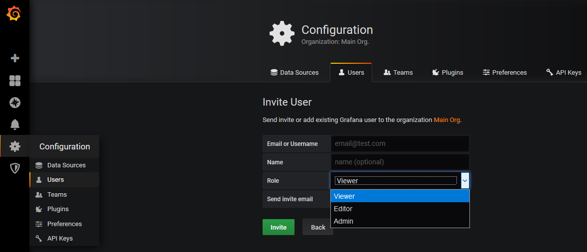 - The admin is allowed to invite users by using the Configuration -> Users menu on the left.