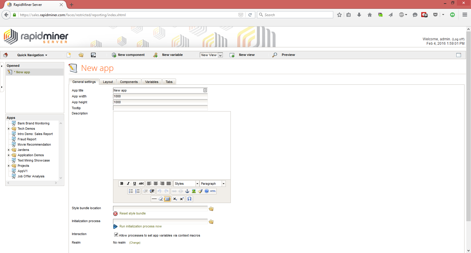 Web Apps are heavily connected to RapidMiner processes. In fact all the logic in a Web App is defined in RapidMiner processes. This tight integration allows the Web App designer to give a variety of in-depth analytical options to the end user. In particular, the end user does not need to have RapidMiner Studio.