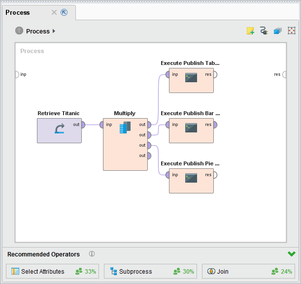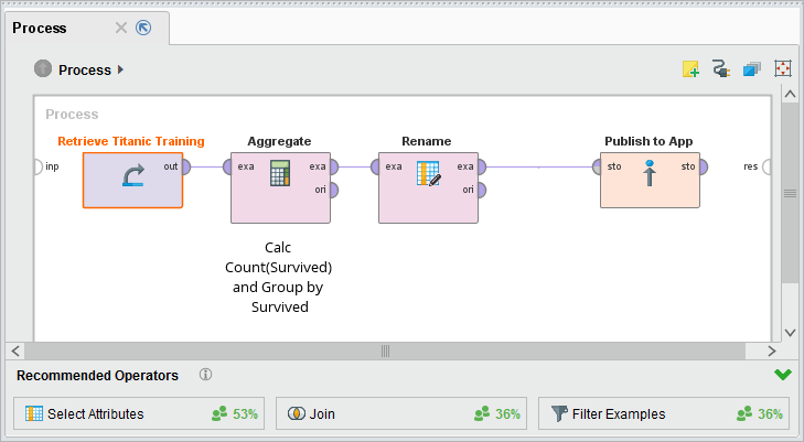 To do this we simply use an Aggregate operator that calculates count of Survived and groups by Survived. For visual reasons we can rename count(Survived) to count. The resulting table will be published to app as Main::PieChartData.