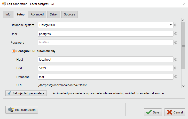 Edit the details of the new connection, e.g. add a description or tags, inject parameters or configure external sources. Press the