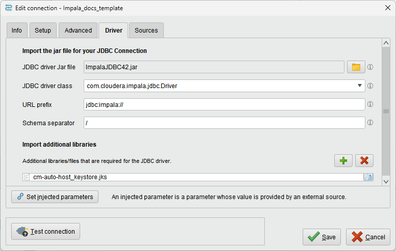 Go to the Driver tab and add the previously downloaded Impala JDBC driver JAR file. Note that the JAR files will be bundled inside the connection itself, so you can move or delete the downloaded files after creating the connection. Add the cluster keystore file to the connection as "Import additional library".